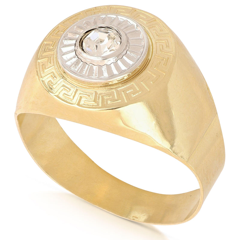 Anello Uomo in Oro Giallo e Bianco 18 Carati con Zircone bianco contornato da motivo greco di 6.70 Grammi.