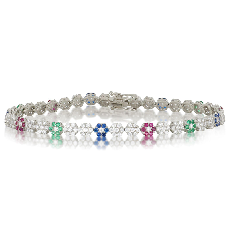 Bracciale modello Magic-Tennis Donna con Zirconi Colorati, in Oro Bianco 18 Carati di 7 Grammi. ll bracciale è lungo 18 centimetri.