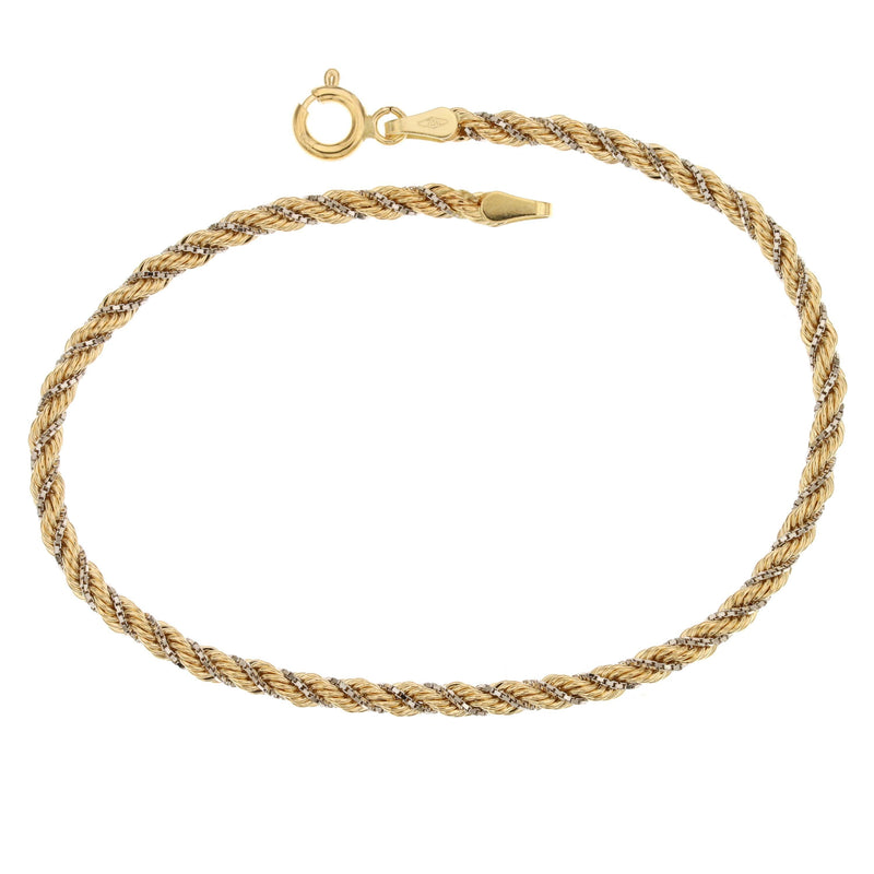 Bracciale modello Fune Laser in Oro giallo e bianco 18 carati di 3 grammi, è lungo 19 centimetri e largo max 0,25 centimetri. Presenta una chiusura con moschettone.