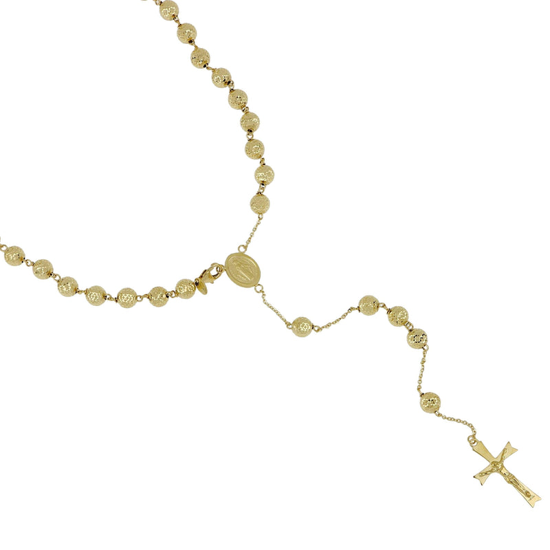 Collana Modello Rosario in Oro Giallo 18 Carati di 19.50 Grammi con grani Martellati di 0,6 centimetri. La collana misura 60 centimetri.