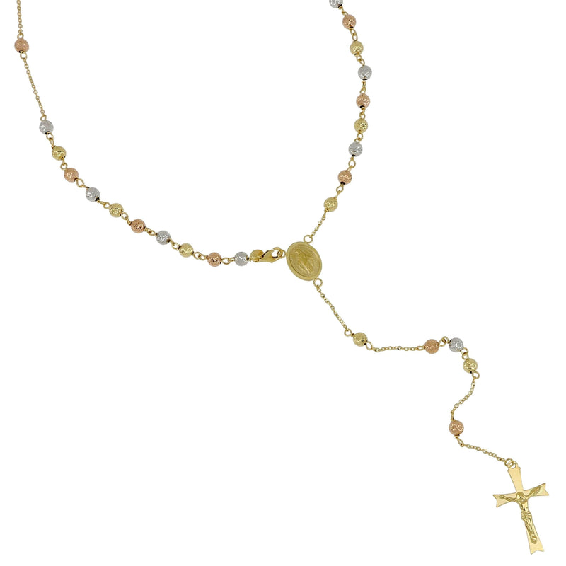 Collana Modello Rosario in Oro Giallo, Bianco e Rosa 18 Carati di 9.90 Grammi con grani Martellati di 0,4 centimetri. La collana misura 60 centimetri.