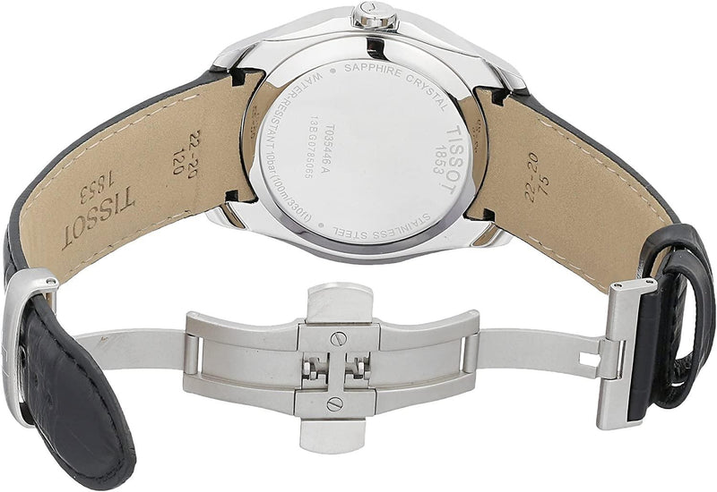 Orologio da polso Tissot T0354461605100. Orologio analogico da uomo con movimento al quarzo, cassa in acciaio inossidabile di diametro 39mm, quadrante nero, vetro minerale e cinturino in pelle.