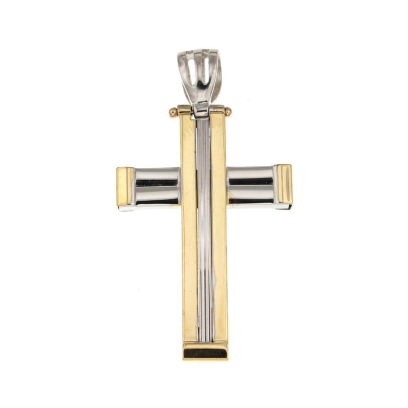 Croce da uomo in oro bianco e giallo 18 Carati lucido e satinato. Il peso è 3.30 grammi.