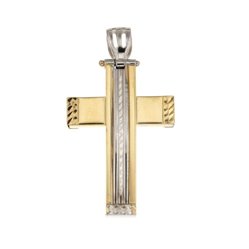 Croce da uomo in oro bianco e giallo 18 Carati. Il peso è 3.30 grammi.