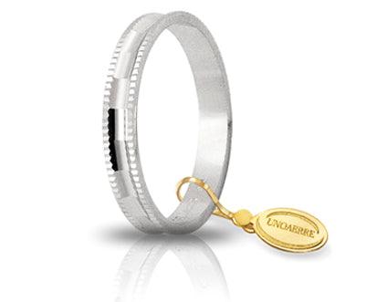 Fedina di fidanzamento "Fiordaliso" in oro 750 bianco in finitura lucida con decorazione diamantata sui bordi e incavo centrale. Gr 1,90 - Mm 3,00