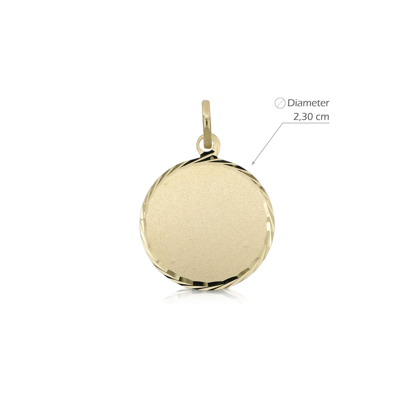 Medaglia personalizzabile Tonda in Oro Giallo Lucido e Satinato 18 Carati con Bordino lavorato di 3.30 Grammi.