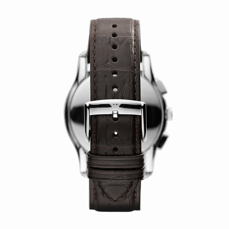 Orologio da polso Emporio Armani AR1785. Orologio analogico da uomo cronografo con movimento al quarzo, cassa in acciaio inossidabile di diametro 44mm, quadrante con numeri romani, vetro minerale e cinturino in acciaio pelle marrone.