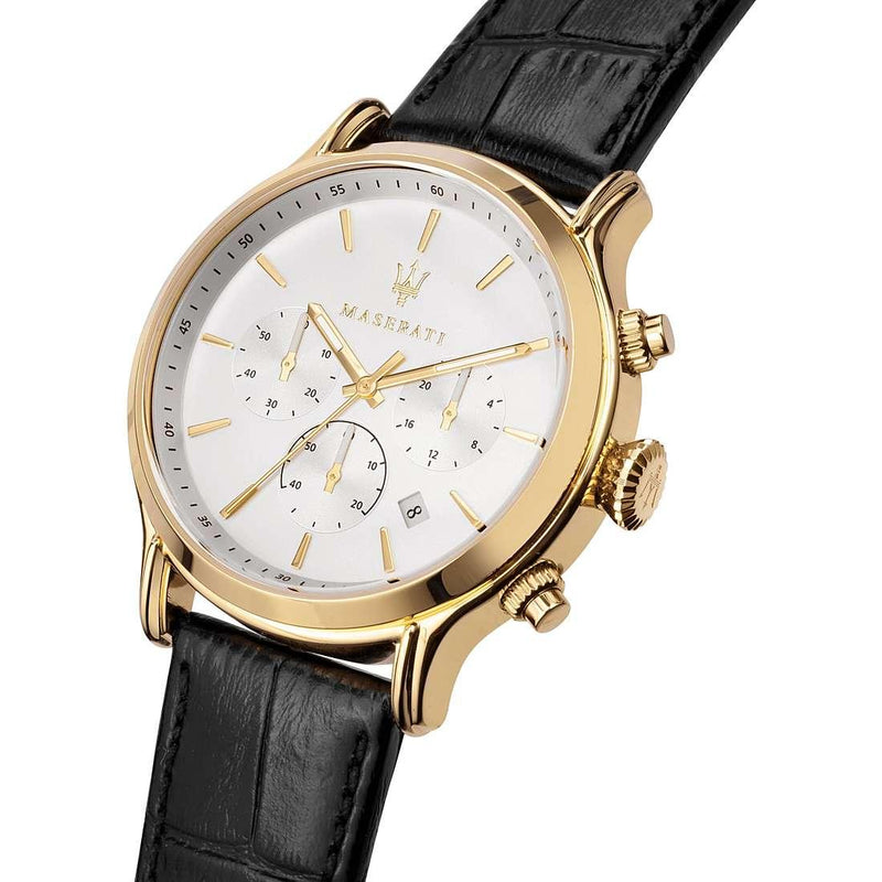 Orologio da polso Maserati R887168012. Orologio analogico da uomo con movimento al quarzo, cassa in acciaio inossidabile di diametro 42mm, quadrante bianco, vetro minerale e cinturino in pelle.