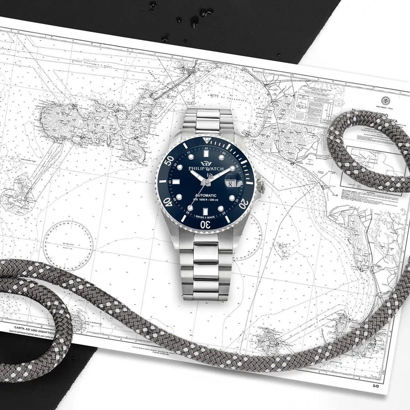 Orologio da polso Philip Watch R8223216011. Orologio analogico da uomo con movimento Automatico, cassa in acciaio inossidabile di diametro 42mm, quadrante blu, vetro zaffiro e cinturino in acciaio inossidabile.