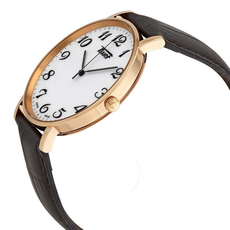 Orologio da polso Tissot T1096103601201. Orologio analogico da uomo con movimento al quarzo, cassa in acciaio inossidabile di diametro 42mm, quadrante bianco, vetro minerale e cinturino in pelle.