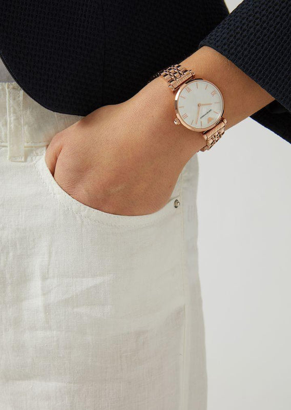 Orologio da polso fashion Emporio Armani AR11110. Orologio analogico da donna con movimento al quarzo, cassa in acciaio inossidabile di colore oro rosa di diametro 32 mm, quadrante fantasia bianco e silver, vetro minerale e cinturino in acciaio inossidabile di color oro rosa.