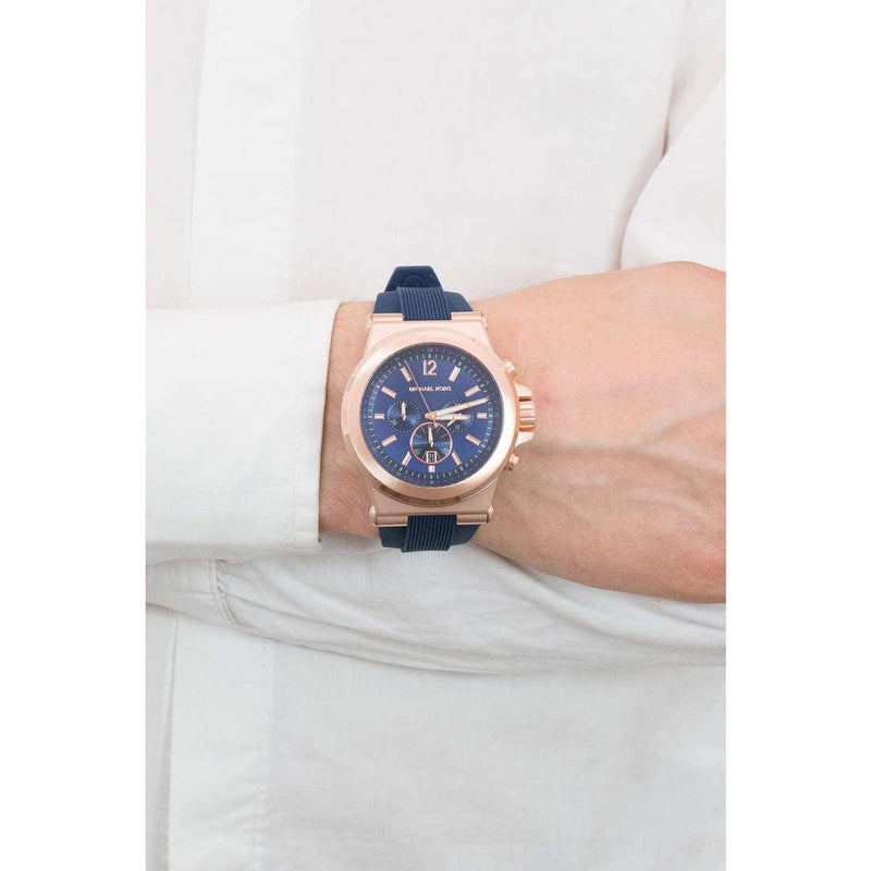 Orologio Michael Kors Da Uomo Della Collezione Dylan. Cronografo Michael Kors Orologi Della Collezione Spring 2013. Il Movimento Dell'Orologio È Al Quarzo, Diametro Della Cassa 48 Cm, Materiale Della Cassa In Acciaio Placcato Rose Gold Con Cinturino In Silicone Blu, Resistenza All'Acqua Fino A 10 Atm. Nuovi Arrivi Gennaio 2015, Referenza: Mk8295