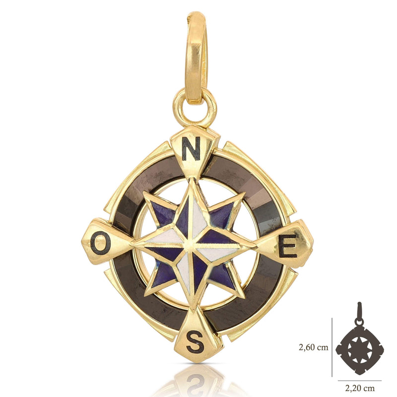 Pendente a forma di Rosa Dei Venti in oro giallo 18 carati e smalti. Il peso è di 4,90 grammi.