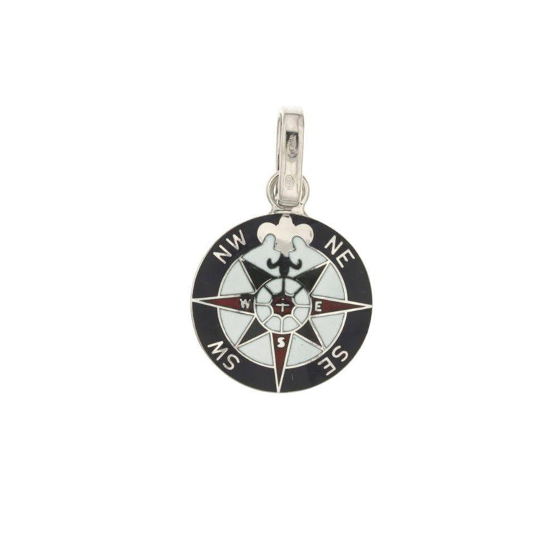 Pendente a forma di Rosa Dei Venti in oro giallo 18 carati con smaltio nero, blu e rosso. Il peso è di 2,5 grammi.