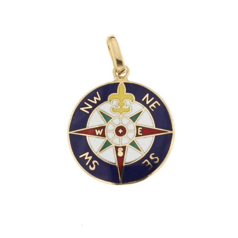Pendente a forma di Rosa Dei Venti in oro giallo 18 carati con smalti. Il peso è di 4,70 grammi.